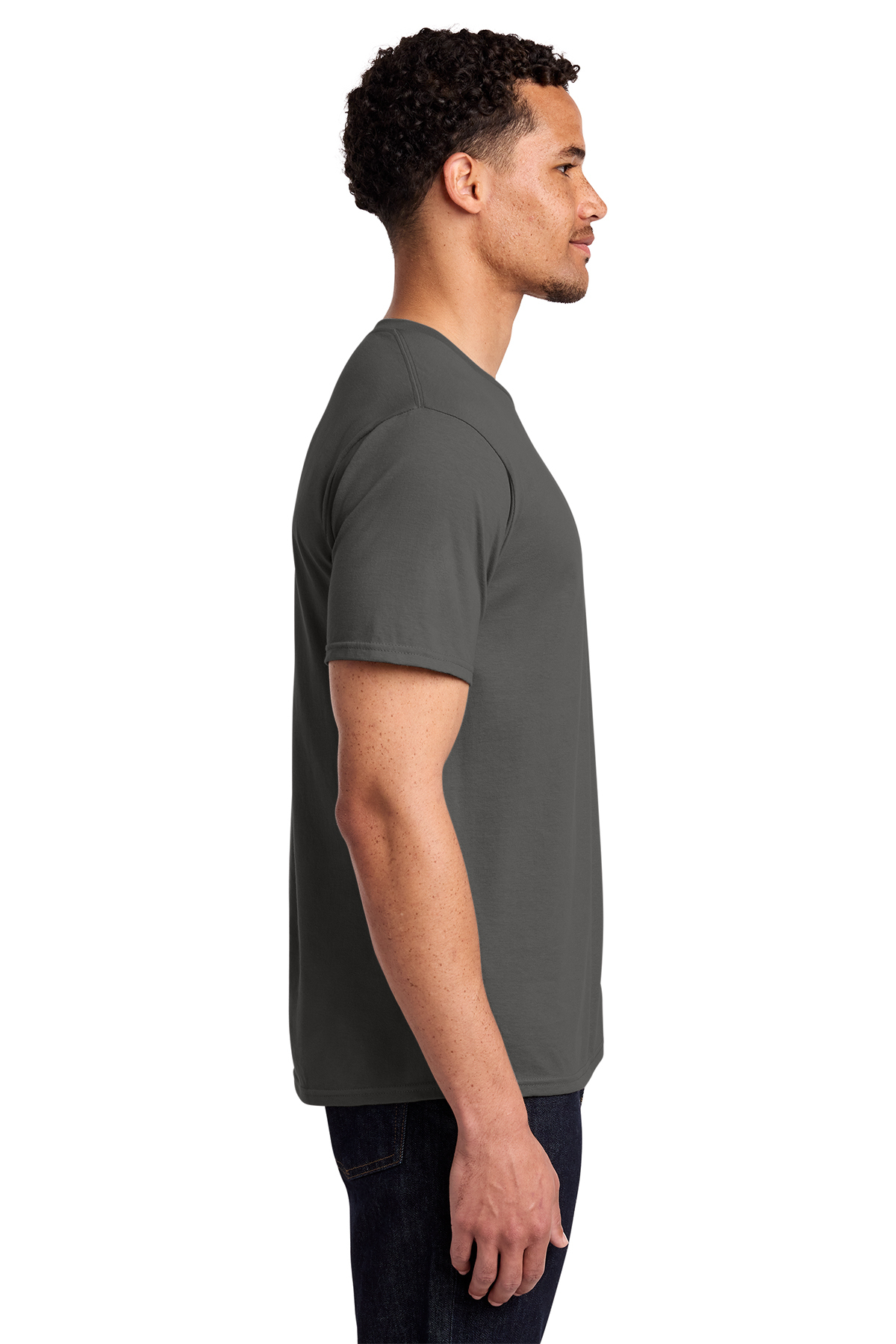 - 50/50 cotton/poly (Dark Heather Grey, Heather Navy)